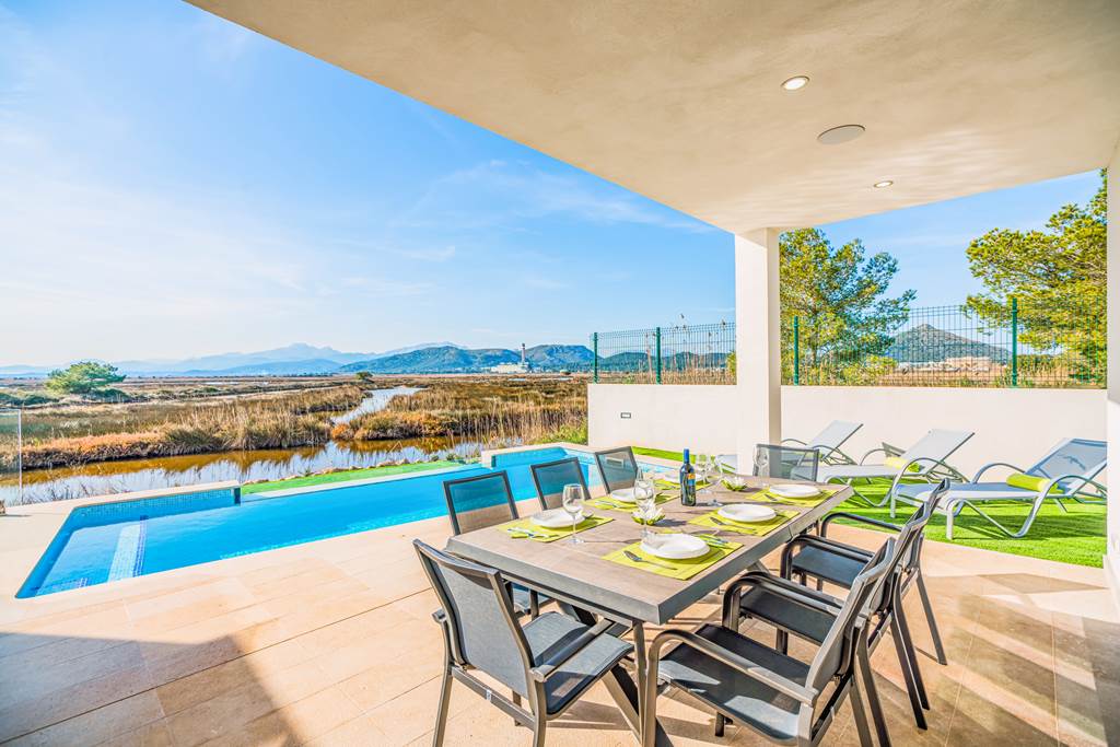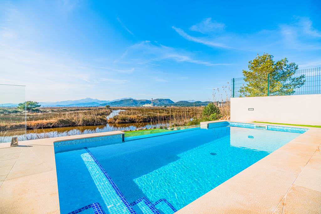 Best of both worlds, the villa enjoys a peaceful setting with amazing views over the renown natural park of 's'Albufera'. Whilst at the same time, only a short walk away from one of the best beaches in Majorca and all the amenities this delightful resort has to offer. Impressive, modern and functional are three words exemplified by the villa. Split on two levels, the ground floor focuses on open plan living. The stylish kitchen and lounge area are fully illuminated by the large sliding glass doors which lead directly onto a stunning terrace with brick barbeque and gorgeous infinity-edge swimming pool. Also on this floor you will find a double bedroom with queen sized bed and a family bathroom with walk in shower, ideal for those with reduced mobility. Upstairs leads you to a further three bedrooms. The master bedroom has a queen-sized double bed and en-suite shower room, with an additional family bathroom shared by two twin bedrooms, both with sliding glass doors leading to a shared balcony overlooking the breath-taking s'Albufera. ... More
