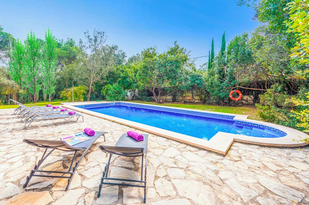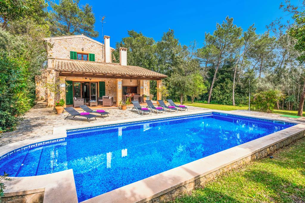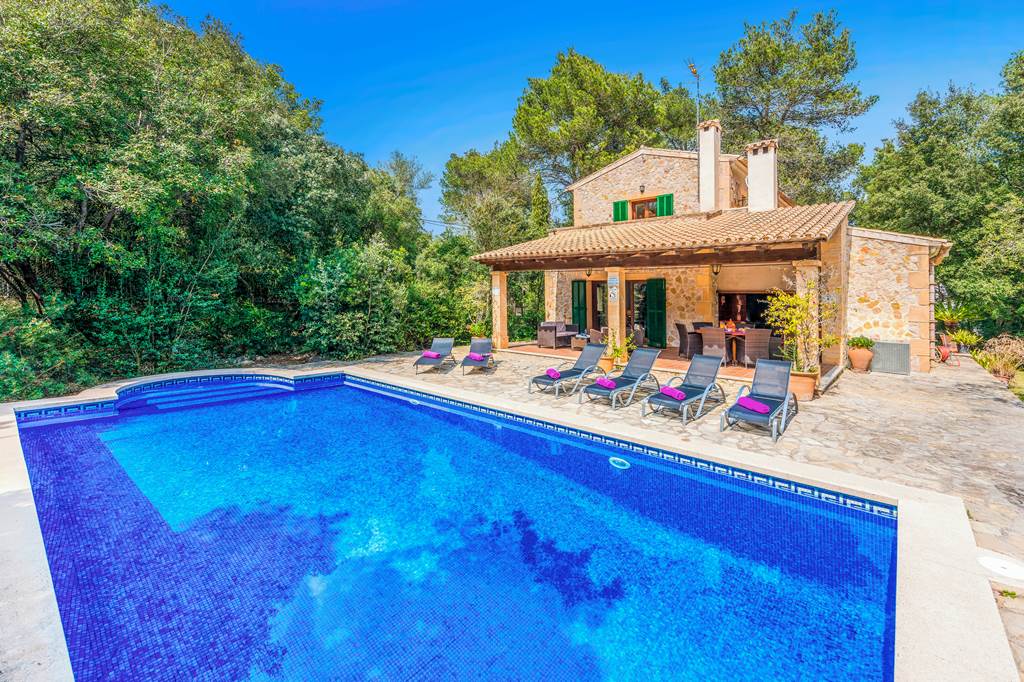 Situated within the outstanding Mallorcan countryside sits Villa Can Joan. This stunning stone-clad property, filled to the brim with traditional charm is a must-see. A large garden and terrace boast an impressive 8 metre long swimming pool, decorated with blue meander pattern tiles and bright mosaics. Evergreen bushes, palm trees and the magnificent Tramuntana Mountains surround the garden, providing a perfect natural backdrop. Around the corner, an outdoor kitchen is fully equipped with a brick-built BBQ, brick pizza oven, oven, basin and fridge freezer. There are so many alfresco dining facilities, you'll be spoilt for choice. Why not sit on the open terrace, share a bottle of wine and talk the night away with the stunning mountain views in the background? There's also table tennis for your entertainment, why not have a game and see who wins? Inside, we find most of the rooms on the ground floor. As you enter Villa Can Joan you'll find yourself in the open plan dining and living area, with beamed ceilings throughout, antique style light fittings, comfortable seating and doors to the terrace gardens. Continue through to a fully equipped kitchen with wooden cupboards, which provides everything you'll need to cook up a feast. Two bedrooms reside on this floor, one double with an ensuite bathroom and one twin room with access to a separate bathroom. A utility area with a washing machine completes the ground floor. ... More