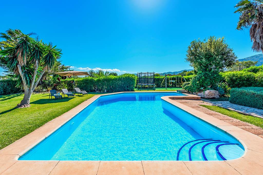 Villa Can Jocs has a homely, continental style with a spacious garden that is in harmony with the surrounding rural countryside. There's a large pool and palm trees dotted around too, while the outdoor kitchen is a unique feature for dining al fresco. Whether you're watching television in the cosy lounge, enjoying a meal in the open-plan dining room or relaxing in a bedroom with wooden beam ceilings, you'll find this villa has plenty of character. Fantastic for families, the outside of the villa even has a play area with swings and a trampoline. Roman steps lead to the spacious pool and there are plenty of shaded areas for unwinding under the sun. You won't have to drive far to reach the lovely coastal resort of Puerto Pollensa and its sandy beach. Shops and restaurants are all less than 2km away too. ... More