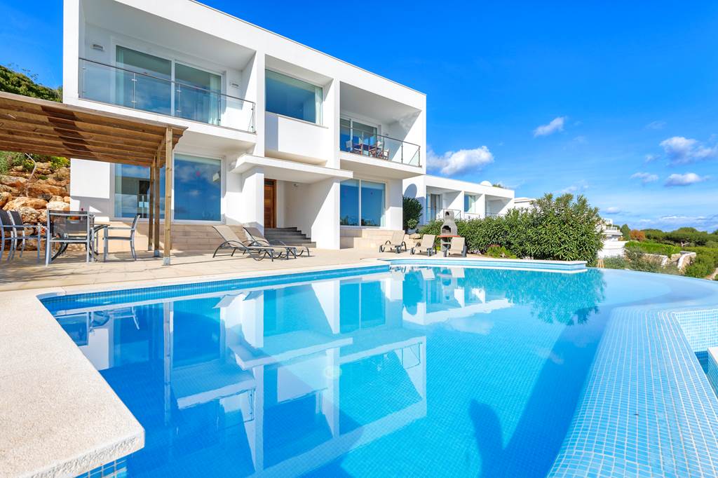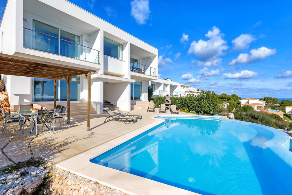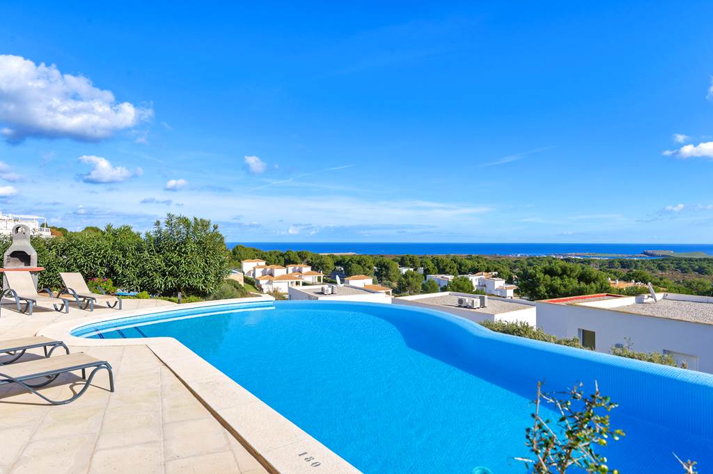 On the hillside in the charming resort of Arenal d'en Castell, Villa Tin Tres is a premium holiday home with astounding views. Its high position means you can gaze out onto Menorca's stunning coastline, all while you're relaxing in the private infinity pool. This pretty whitewashed villa has a brilliant outdoor space, fully-equipped with sun loungers, a stone barbecue and dining furniture. Enjoy your lunch under the shaded terrace before catching more rays! With an open-plan living/dining/kitchen area, Villa Tin Tres has an airy feel throughout. This continues into the four bedrooms, which have air-conditioning to keep you cool on warm nights. There's so much to see nearby, with local shops and restaurants reachable on foot. A brief drive will take you to the fishing villages Na Macaret and Port Addaia, as well as the popular Son Parc golf course! ... More