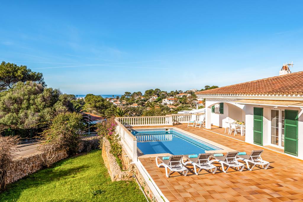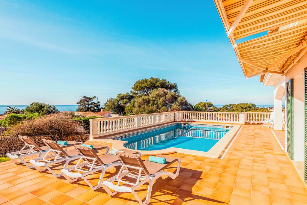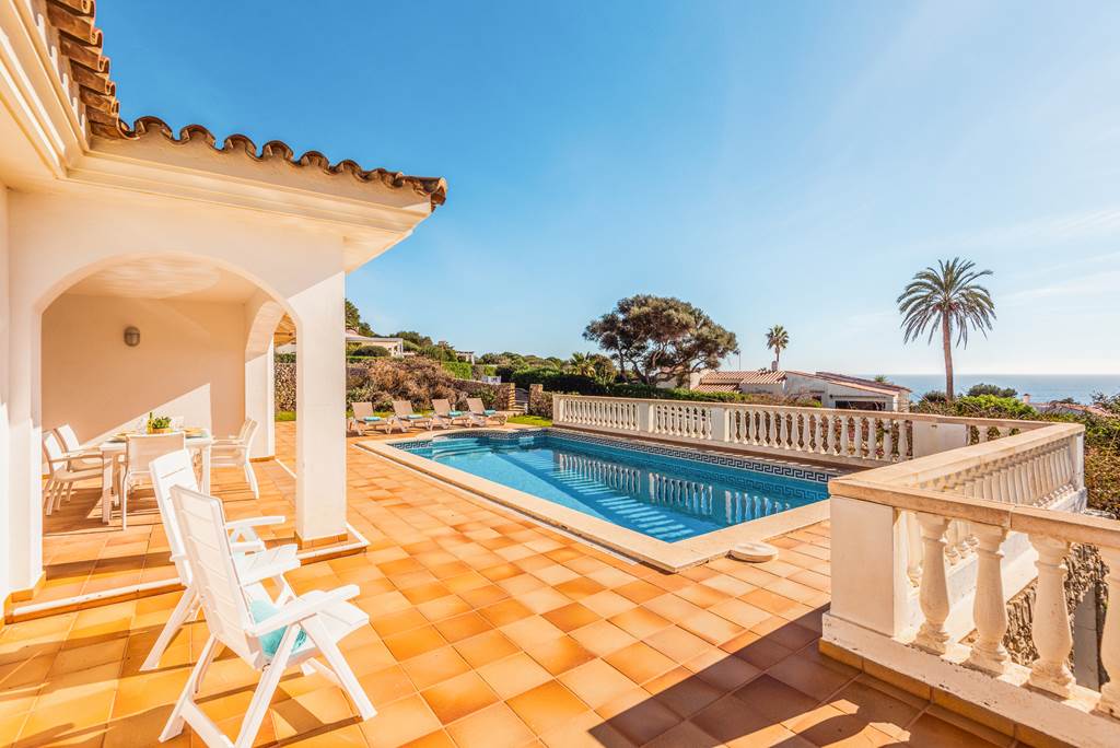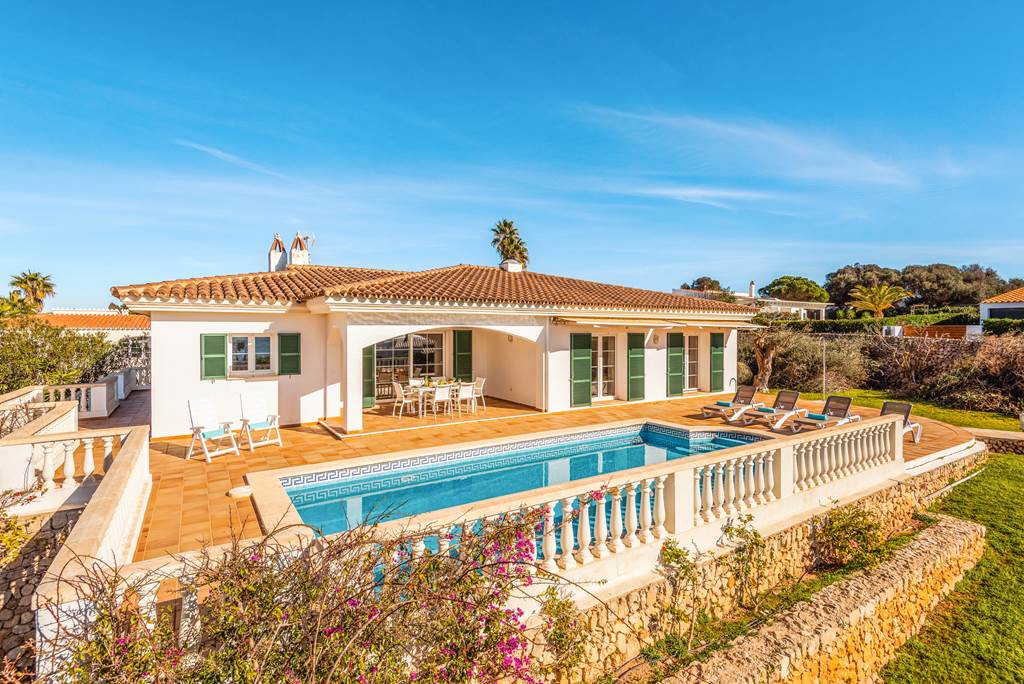 This beautiful villa is extremely well situated in the sought-after resort of Binibeca. Its elevated position means that the panoramic views from the pool terrace are phenomenal and at less than 10-minute walk to the superb sandy beach, what more could you ask for? Restaurants and shops are also within easy reach and the pretty white-washed fishing village of Binibeca Vell just a short walk away. The villa itself is extremely spacious with light and airy rooms and has been tastefully decorated throughout. The three bedrooms each have their own en-suite facilities making preparation for nights out on the town run smoothly. The main living space is open plan, with a fully fitted kitchen, dining area and comfortable lounge to relax in. Large patio doors open out onto the terrace allowing a gorgeous natural breeze to flow through the villa. Outside is undoubtedly where you will spend many happy hours relaxing on a sun lounger, taking a swim in the glorious swimming pool, or simply enjoying family meals al-fresco on the covered terrace, which provides welcome shade on those sunny summer days. ... More