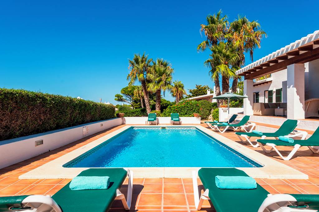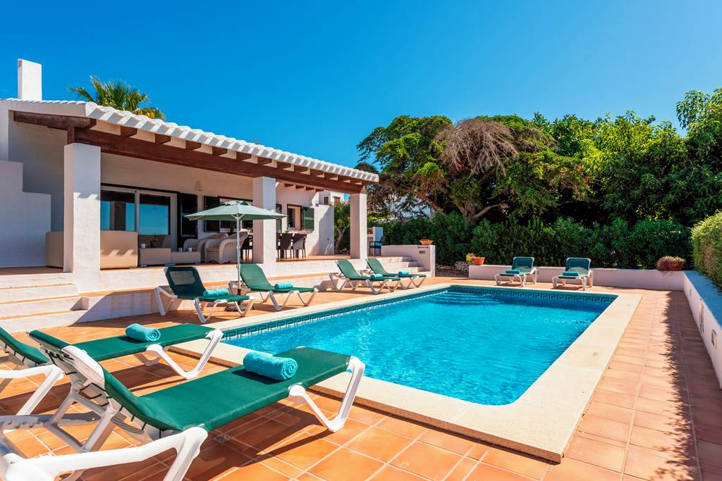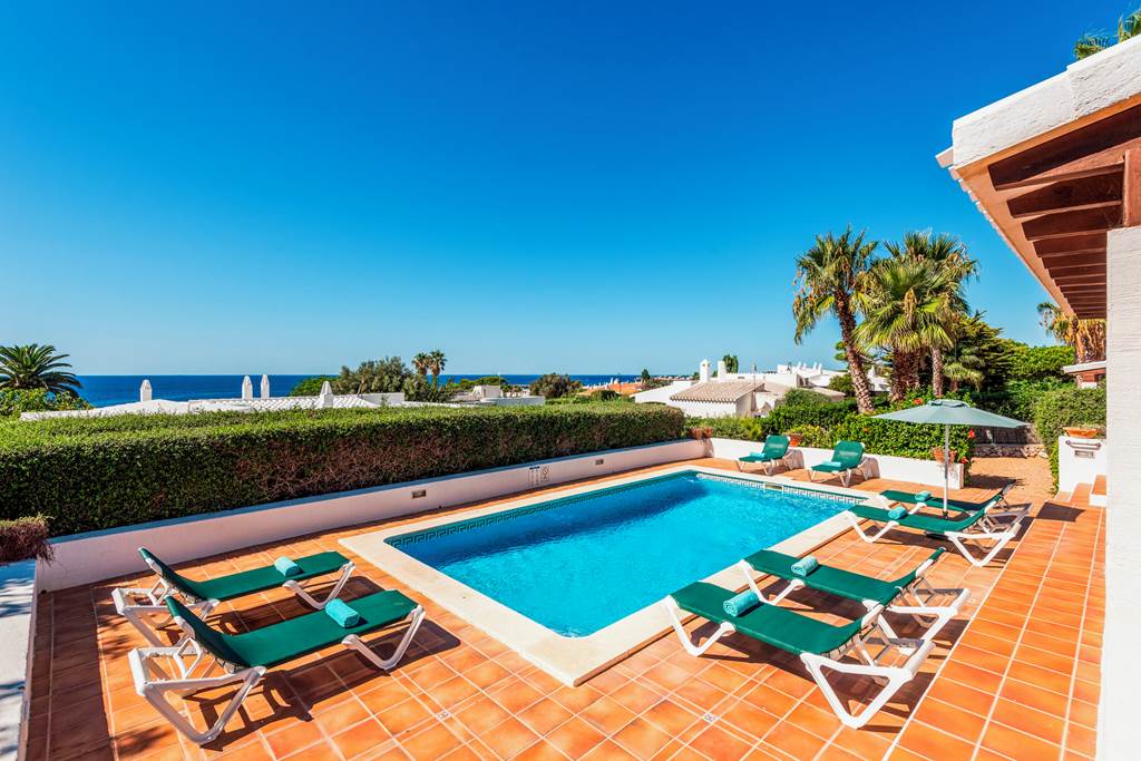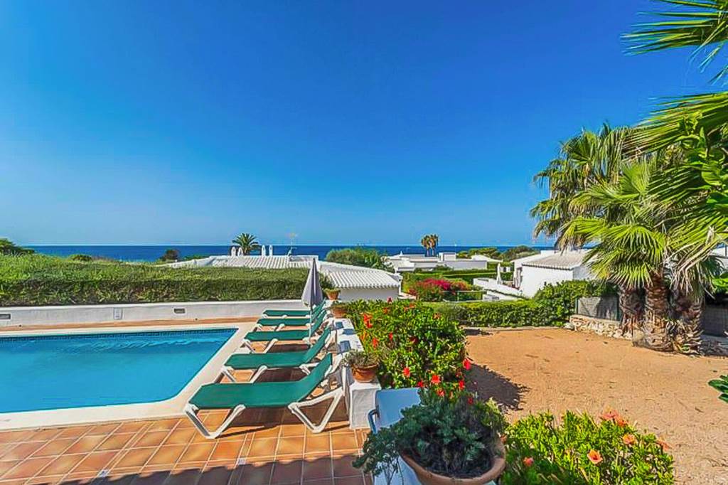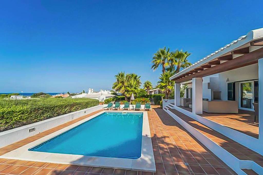 Located within Binibeca, this stunning property is ideal for those wanting a sunny Menorca getaway. You can't get much closer to the amenities, as local shops, bars and grills are just around the corner. With its long stretch of rocky coastline, Binibeca is a great choice for those wanting a sea view. At Bini Carmen, you'll find just that. The poolside terrace boasts distant panoramic sea views across the Mediterranean. Enjoy a morning coffee by the pool as you admire the boats that sail along the horizon. The covered terrace is a great spot for midday alfresco lunches and cosy evenings on the exterior sofas. ... More