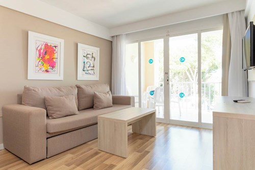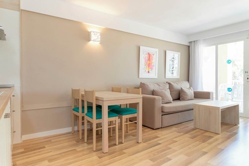 These bright well-equipped apartments are ideal for those wanting accommodation in a great location, with one of the most stunning beaches on the island is only a short walk downhill. In fact you can see the sea from the poolside! The sea here is gentle and shallow for the little ones, plus there is a selection of watersports on offer for the more adventurous. For those wanting to explore the beautiful island further, meals can be taken at sister hotels, Tramontana Park Aparthotel in Playa De Fornells or Isla del Aire Apartments in Punta Prima (reservation required). Couples and families looking for a relaxing holiday will find the half board option a perfect choice. ... More