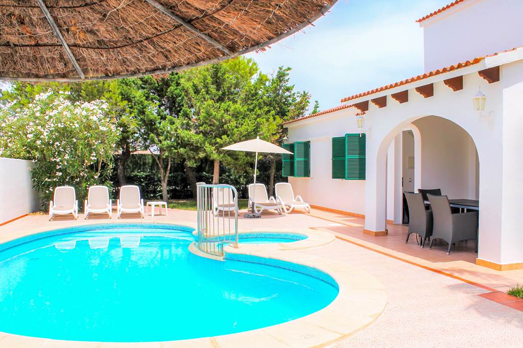 In a fantastic location close to the centre of Cala en Forcat, Villa Raquel Blanes is a great choice for your summer holiday. Numerous restaurants and bars, shops, play centres, an aqua park and sandy cove are all within easy reach of the villa, meaning car hire is not necessary for those wanting to forget the stress of every day life. In the villa you will find four bedrooms, two of which have ensuite facilities and a separate family bathroom for the others to share. *Please note the first floor bedroom AC unit is located on the landing facing the bedroom doorway. The villas has a modern, open plan living room/kitchen/diner with thoroughly stylish decor. Stepping out from the living area you have a covered terrace for al fresco dining and a beautiful private swimming pool fringed with loungers to soak up the hot Mediterranean sun. The nearby old capital, Ciutadella is a short bus ride away and a must see for everyone. Narrow cobbled streets are littered with boutique shops and a vast array of restaurants and bars can be found both in the town and along the beautiful port side, not to mention hand crafted night markets to wander round in high season to search for a special holiday souvenir.For groups travelling together, Villas Ingrid, Karoline and Sofia are conveniently located on the same street, ideal for the big family holiday reunion, yet with a certain degree of privacy in your own individual villas. ... More