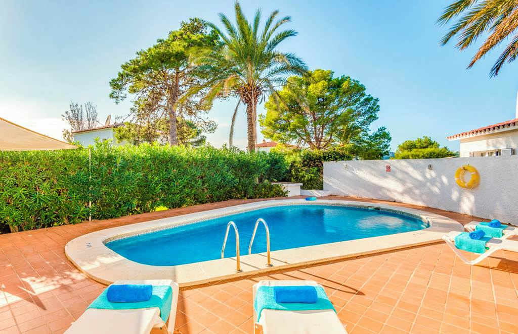 With superb sea views and tucked away in a pretty residential area near San Jaime, Villa Marismas Sombra is a two-bedroom villa fit to satisfy your every need on your holiday to Menorca. Inside, the villa has been designed with bright furnishings for a feeling of even more space to relax in after exciting days spent exploring the area. There are two air conditioned bedrooms and a kitchen to cook tasty treats. If you want to listen to music in the shade or sit in the scorching Spanish heat all afternoon, Villa Marismas Sombra's terrace area is fantastic to laze in. Take a dip in the swimming pool underneath palm trees and sample outdoor Menorcan living in style. Sitting next to our sister property Villa Marismas Sol, Villa Marismas Sombra is a great choice for those travelling in groups. ... More