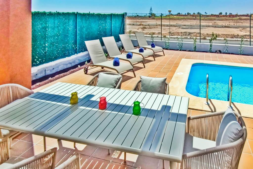 Situated in a convenient location within the popular golf complex of Caleta de Fuste, Villa Angelita is a great choice for a villa holiday in Fuerteventura. Living accommodation is all on one level, offering a kitchen with a small breakfast area and a well-equipped lounge which leads out to a covered dining terrace, ideal for alfresco barbecues in the glistening sunshine. Beyond the large terrace area is an inviting outdoor pool heated during the winter months and perfect for either families or groups of friends to enjoy. There are also three bedrooms and two bathrooms with ample storage space and tasteful modern décor. The resort of Caleta de Fuste is popular with young families as the beautiful golden beach has calm, clear, sheltered waters, and there’s a wealth of attractions for all ages. Excellent amenities in the area include the Atlantico shopping centre, multiple restaurants serving international cuisine, and the prestigious championship golf complex. A little further along the coastal road brings you to the island's capital of Puerto del Rosario, boasting two impressive beaches, plenty of shopping and marina-front cafés. ... More