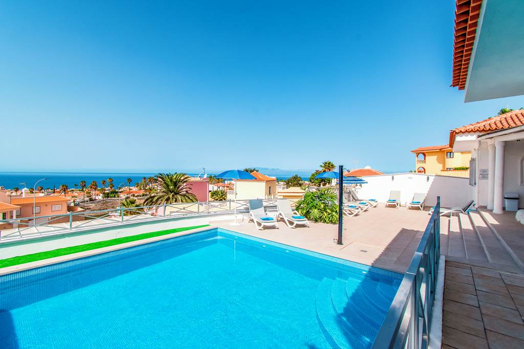 Villa Venecia sits in a prime location, just a stone’s throw away from the very heart of Callao Salvaje. This resort is a quieter alternative to the nearby Costa Adeje, but no less worthy, situated in the very south of Tenerife, this is an ideal place to spend a relaxing holiday due to the warm climate throughout the year. A trip to the black sand Ajabo beach is just a short 15-minute walk away, lined with traditional straw parasols and protected by a rocky cliffside. The main street features an array of cuisines, including tasty traditional paellas, seafood platters, mouth-watering pasta and authentic tandoori dishes. What caught our eye at Villa Venecia? It has to be the covered terrace with classic columns! This spacious outdoor terrace boasts cosy comfortable seating, alfresco dining and distant sea views. A few steps take you to the poolside, where you'll notice plenty of sun loungers and a refreshing pool to use at your convenience. ... More