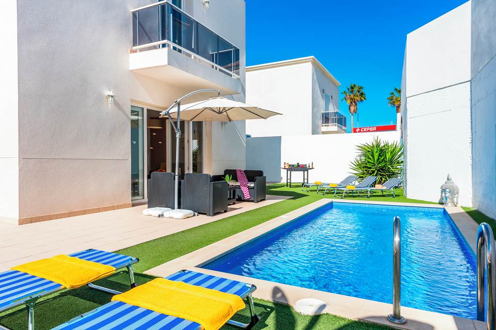 Villa Gaillardia is a stylish villa with everything needed for a fantastic holiday in Costa Adeje. With four bedrooms split across three levels, this whitewashed villa provides comfortable and spacious accommodation and offers a beautiful swimming pool for your pleasure. This villa is the perfect choice if you are travelling in a large group or family – as it is conveniently located in the exclusive development called Royal Dream complex, including Villa Acacia, Belladonna, Campanula, Dahlia, Farfara and Campanula. The location of this contemporary gem could not be better, with a selection of shops, restaurants and a large supermarket just a few minutes walk away, whilst the stunning Fanabe beach and resort centre of Costa Adeje can be reached in a 15-minute stroll. ... More