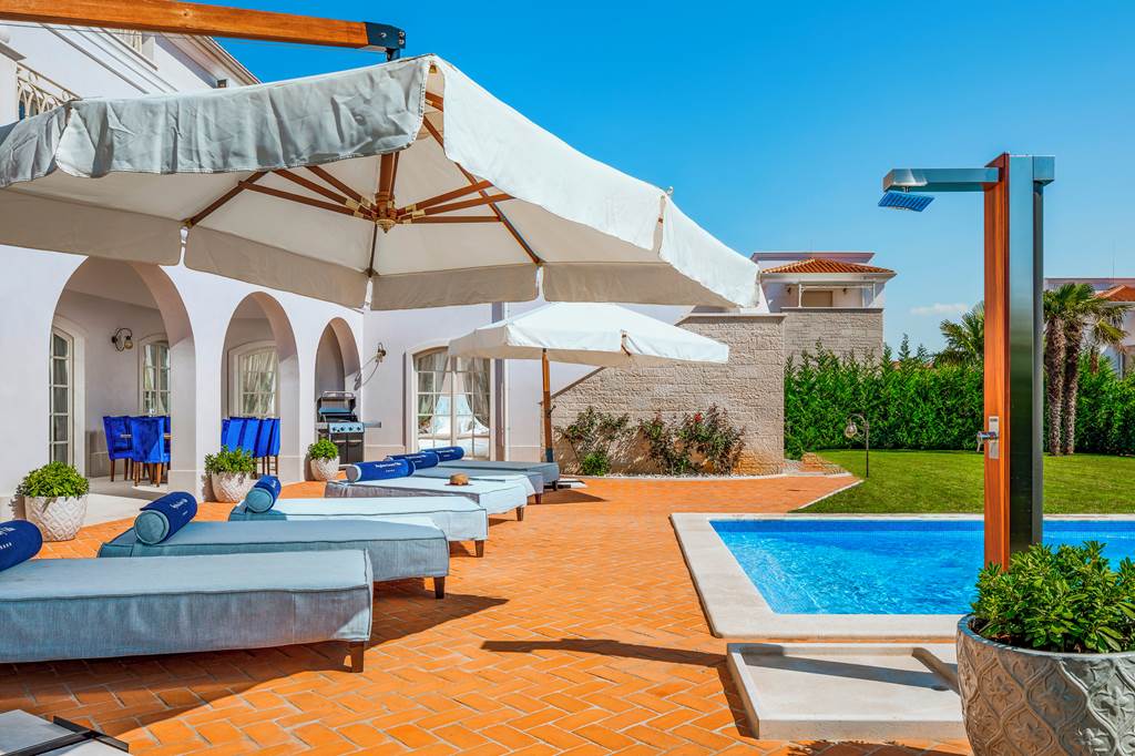 Oozing with timeless glamour and modern features, Prestige offers an unforgettable stay in the incredible Porec. Designed to exude grandeur and ensure the guest has everything they need, this villa certainly lives up to its name. From fabulous light fittings to hand-picked accessories the decoration runs smoothly throughout the villa to make it shine. Step through the grand doors into the entrance hall and immediately feel the 'wow' factor on offer. A beautiful marble staircase with an ornate railing leads up to the first floor while several patio doors lead onto the extensive garden and pool terrace. In the lounge, you'll be greeted by a warm and inviting atmosphere with chic seating facing a flatscreen TV at the centre of a built-in unit. A delightful dining room lies adjacent to the marble-surfaced kitchen holding all the essentials required for a seamless self-catering experience. Each of the bedrooms has individual flair but maintains the fluidity of the overall character Prestige holds. The magnificent interiors have much to offer, but we imagine you'll spend a lot of your time in the incredible exterior space. A luscious lawn surrounds the villa and the large private pool with plush sun beds for you to lounge on. ... More
