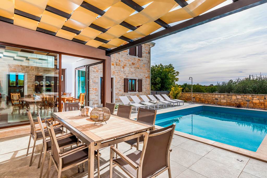 Located in the picturesque rural village of Vosteni, Villa Rural Stone Lux stands as a testament to refined living. This meticulously renovated stone villa invites up to eight guests to bask in its modern comfort. This villa unfolds across two separate buildings, accessed by a sheltered terrace next to the private pool. Here, under the warm Mediterranean sun, you’ll discover the heart of your retreat. Step into the first house, where the ground floor reveals a modern, fully-equipped kitchen, seamlessly connected to an open-plan dining area, with large sliding doors leading to the terrace beyond, as well as a cosy living room and stairs leading up to the first two bedrooms. Ascend to the upper floor where two bedrooms await, each boasts an en suite bathroom, and one graciously opens onto a balcony. ... More