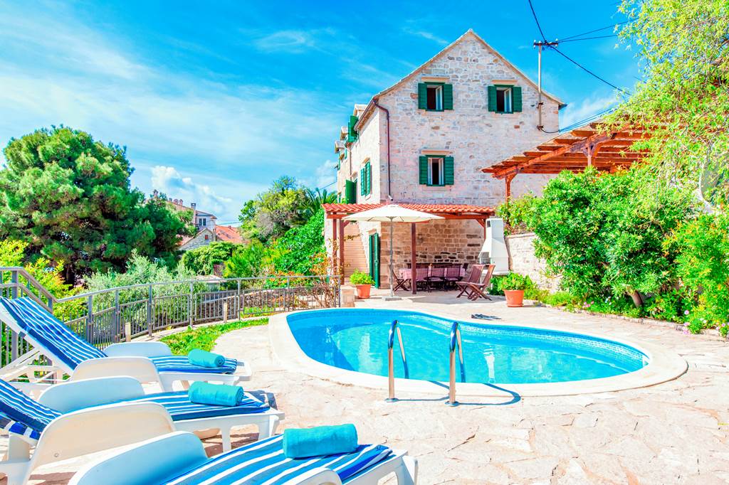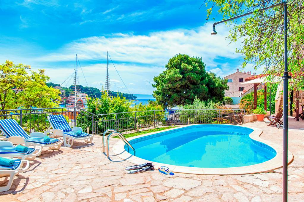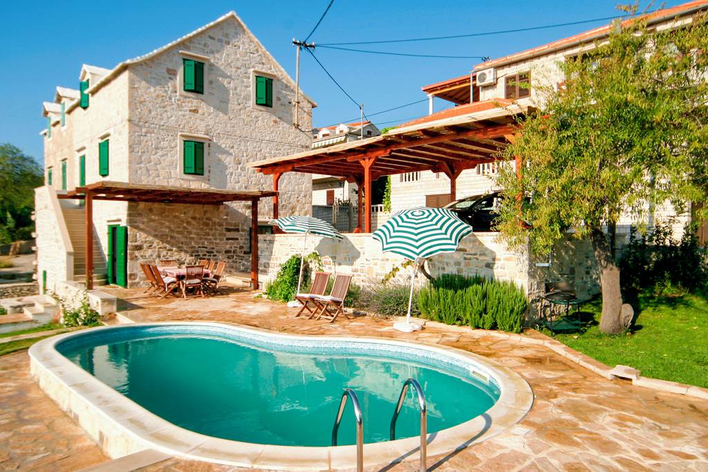 Villa Bonaca is located in the centre of Sumartin. In Croatian the villa name means tranquility. It has everything you need on your vacation. Beautiful view of the sea, vicinity to the beach, ferry and bus station. It is surrounded by numerous bars, taverns – restaurants of traditional Dalmatian food, and supermarkets. This charming three-storey house has 3 bedrooms (two on the first floor and one on the second), a kitchen / dining area on the ground floor, 2 bathrooms with toilets and a separate WC, a large garden with a private pool and parking for 2 cars. ... More