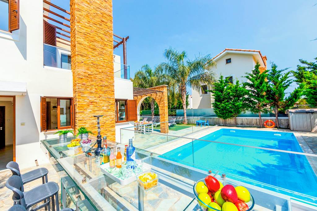 If you're looking for a chilled holiday not far from the popular resort of Ayia Napa, then look no further. Ionion Seaside Villa is a stunning example of a traditional Cypriot villa, boasting a stylish terrace with a natural stone patio, filled with olive and palm trees. Sunbathe in style whilst using one of the palm trees for a light spot of shade, or enjoy a dip in the 8x4m pool to cool off from the midday sun. As an added benefit, this beautiful property also comes with a fenced pool, wrap-around garden and off-road parking. Doors leading from the terrace take us indoors to the open-plan living room and kitchen. This cosy room, with neutral colours, comes fully equipped with all the latest cooking appliances, air conditioning and a flat screen television offering a variety of channels. Bedroom one also resides on the ground floor, complete with bunk beds, a single bed, air conditioning and sliding patio doors with easy access to the terrace. Upstairs, we find the remaining two bedrooms, one is a master double with ensuite, whilst the other bedroom offers another bunk bed alongside a single bed. A short 15-minute drive takes you into the very heart of the ever-popular resort of Ayia Napa. With medieval architecture, local museums, an impressive shopping scene, and bustling nightlife, there'll be plenty to do for all generations. ... More