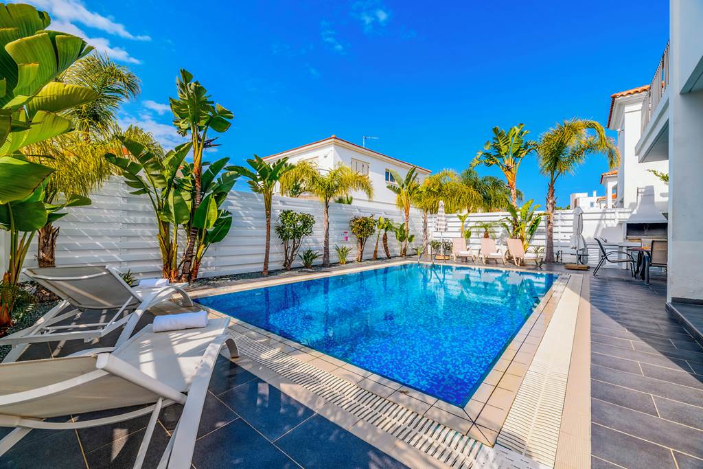 Welcome to Blue Pelagos Villa, a charming 3-bedroom, 2-bathroom retreat located in the heart of the stunning Protaras coastline. Perfectly positioned just 2.5 km from the bustling Protaras resort centre, this villa offers a serene escape within walking distance of golden beaches, local shops, and fantastic restaurants. The villa boasts a bright and airy open-plan living area, thoughtfully designed and is stylishly furnished, with a fully equipped kitchen, a cosy lounge, and a dining area ideal for gathering after a day of exploring the island. Large windows invite natural light to flood the space, creating a welcoming atmosphere for all. Surrounded by a beautifully maintained outdoor space, perfect for relaxing with a morning coffee or enjoying al fresco meals under the warm Mediterranean sun. With its unbeatable location and modern amenities, Blue Pelagos Villa ensures a memorable holiday for couples, families, and friends alike. ... More