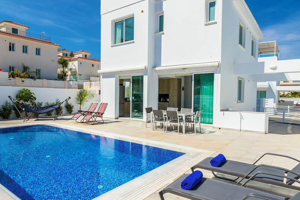 Villa Araella, located in the sought-after Green Bay area of Protaras, is a stylish three-bedroom, four-bathroom villa ideal for families or groups. The villa features a spacious terrace, modern interiors, and an open-plan living area with a fully equipped kitchen, lounge, and dining space. Each of the three tastefully furnished bedrooms offers a peaceful retreat. The terrace is perfect for soaking up the Mediterranean sun, dining al fresco, or enjoying a refreshing drink. Just 1km from Green Bay beach and 2km from the Protaras resort centre, Villa Araella is a perfect base for relaxation and exploration. ... More