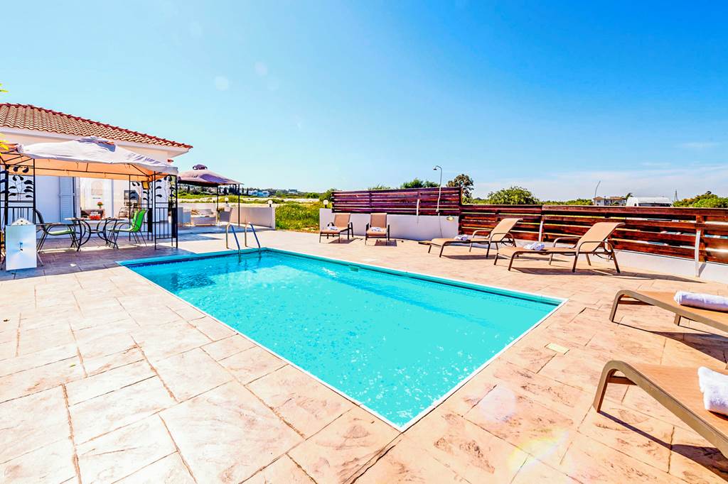Villa Protaras Sunset is an ideal getaway for up to four guests. This cute hideaway is nestled right on the edge of the Protaras strip, meaning there's no need to hire a car. You're only a stone's throw from all the local amenities, entertainment, bars, and restaurants. With two bedrooms and one bathroom, this villa is ideal for smaller bookings, or couples wanting to enjoy the year-round sunshine Cyprus has to offer. The poolside terrace is a great spot for topping up your tan, as fresh produce cooks away on the barbecue, making for a delicious mezze lunch. Inside, the living area and kitchen are open plan, with a comfy seating area, cool air-conditioning, and a fully equipped kitchen. Patio doors allow natural sunlight to flood this space, creating a warm and cosy vibe. ... More