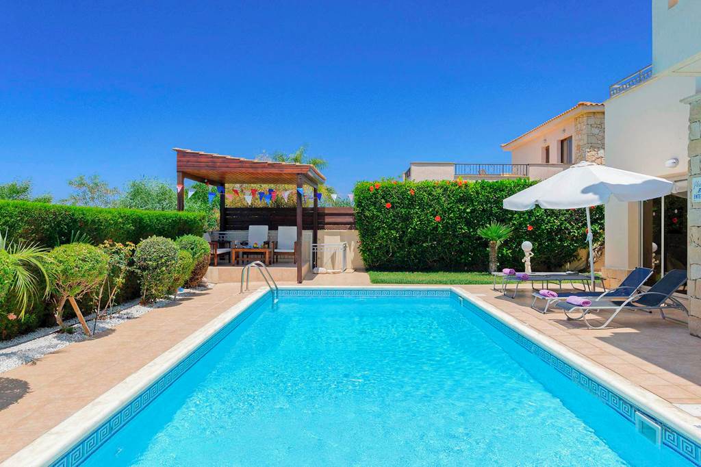 This lovely detached three-bedroom villa with sea views is conveniently located in a small cul-de-sac, just 200m from shops, bars, and restaurants and 500m from the safe, sandy beach of Coral Bay. The accommodation is on two levels with open plan living areas on the ground floor, a master double bedroom with en-suite walk in shower, two twin bedrooms and a full bathroom on the first floor. All the bedrooms have their own balconies, two with sea views. Outside there are covered and sun terraces, an 8m x 4m swimming pool with roman steps, a brick built BBQ, and ornamental gardens with lawns. ... More