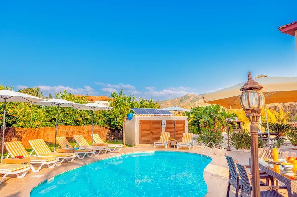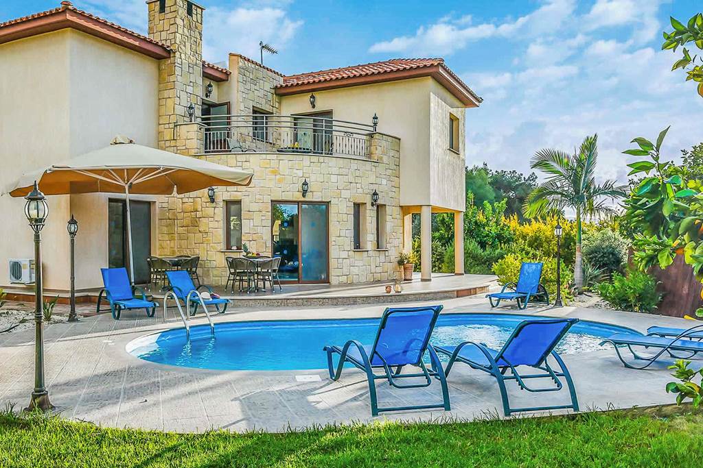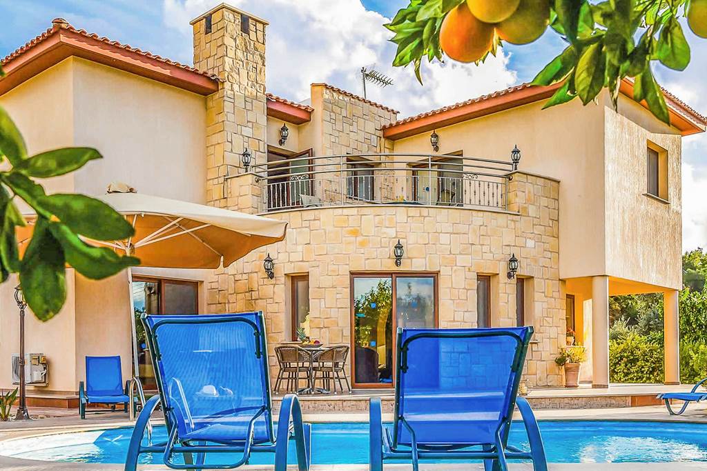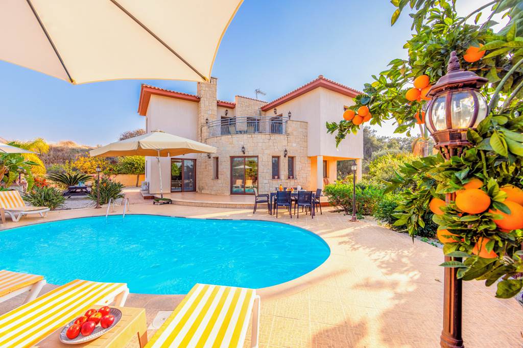 Located on the West Coast of Cyprus, Villa Stavros is a great choice for those wanting to explore this history-drenched island. With ancient ruins, medieval churches and traditional towns, this stunning island is sure to impress you with its wonders of the world. For lazy days by the pool, Villa Stavros is an ideal choice. The terrace is lined with sun loungers and surrounded by exotic shrubs and fruit trees, giving you that authentic Mediterranean vibe. There's an 8m kidney-shaped pool for splashing around with the kids or swimming a few lengths to cool off. Inside, the villa is spread over two floors. On the ground floor, we find the kitchen and living room, complete with a smart TV for home entertainment. There's also a bedroom that has access to a separate shower room with a massage shower, great for relaxing after a long day at the beach. Upstairs we find the remaining three bedrooms, all with their own ensuites and cool air conditioning. The master bedroom even has the added benefit of a whirlpool bathtub and balcony terrace that can also be accessed from the landing. ... More