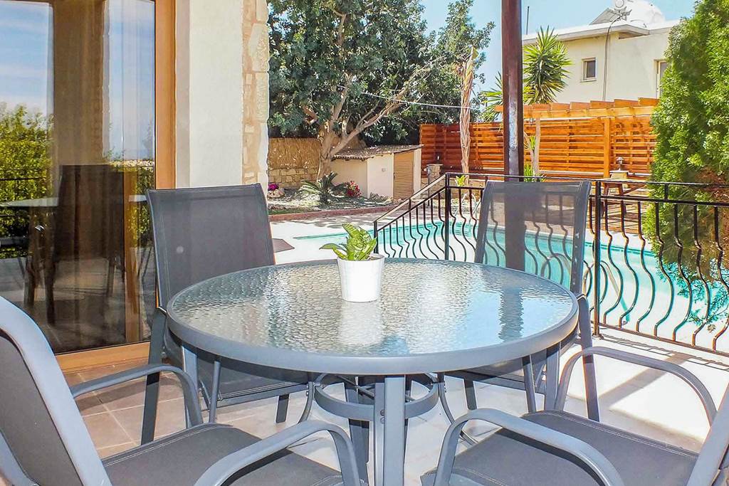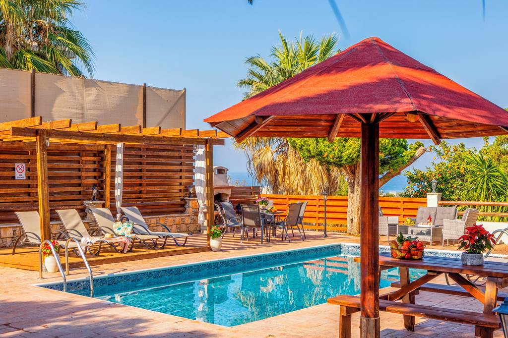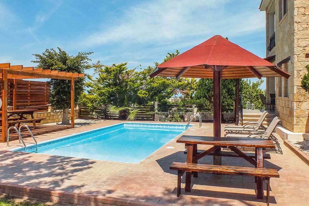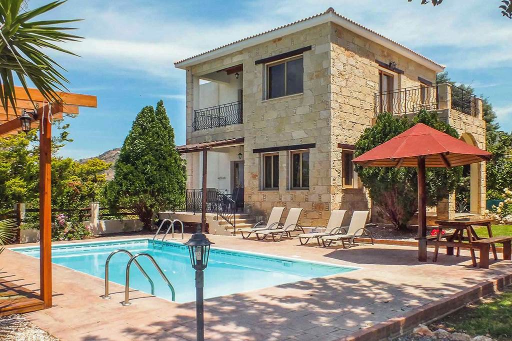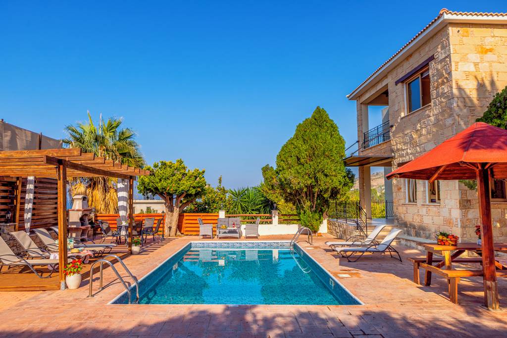 Charming Villa Stella Aragka takes its name from the stunning area of Argaka on the West Coast of Cyprus. With a coastline stretching over 8km long and dotted with tavernas and beach bars, Villa Stella is the ideal place for those that love to catch the waves. For long days spent under the Cypriot sunshine, then look no further than the poolside at Villa Stella Aragaka. The refreshing pool takes centre stage at a modest 8x4m, lined with reclining sun loungers and surrounded by a green garden filled with exotic swaying palm trees and shrubs. Inside, the villa is homely with soft furnishings, neutral colours and an open-plan living space. Patio doors lead off the terrace into the comfortable living room, complete with a smart television for home entertainment. There are three bedrooms in total, one double room on the ground floor with access to a bathroom and a further two bedrooms on the first floor, both with private ensuites and access to a balcony each. ... More