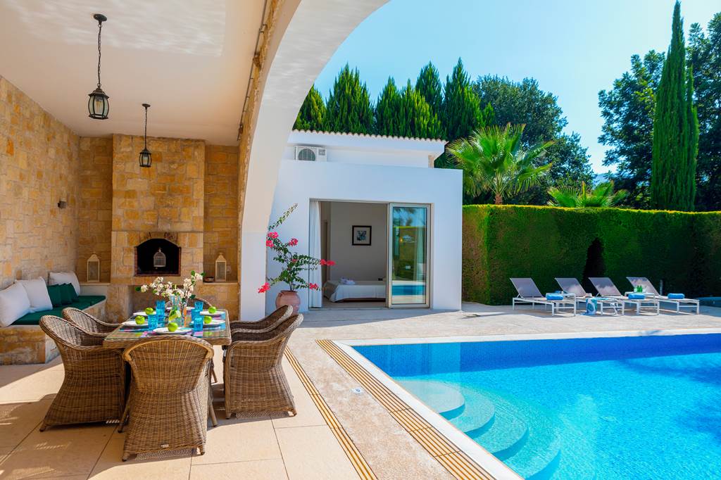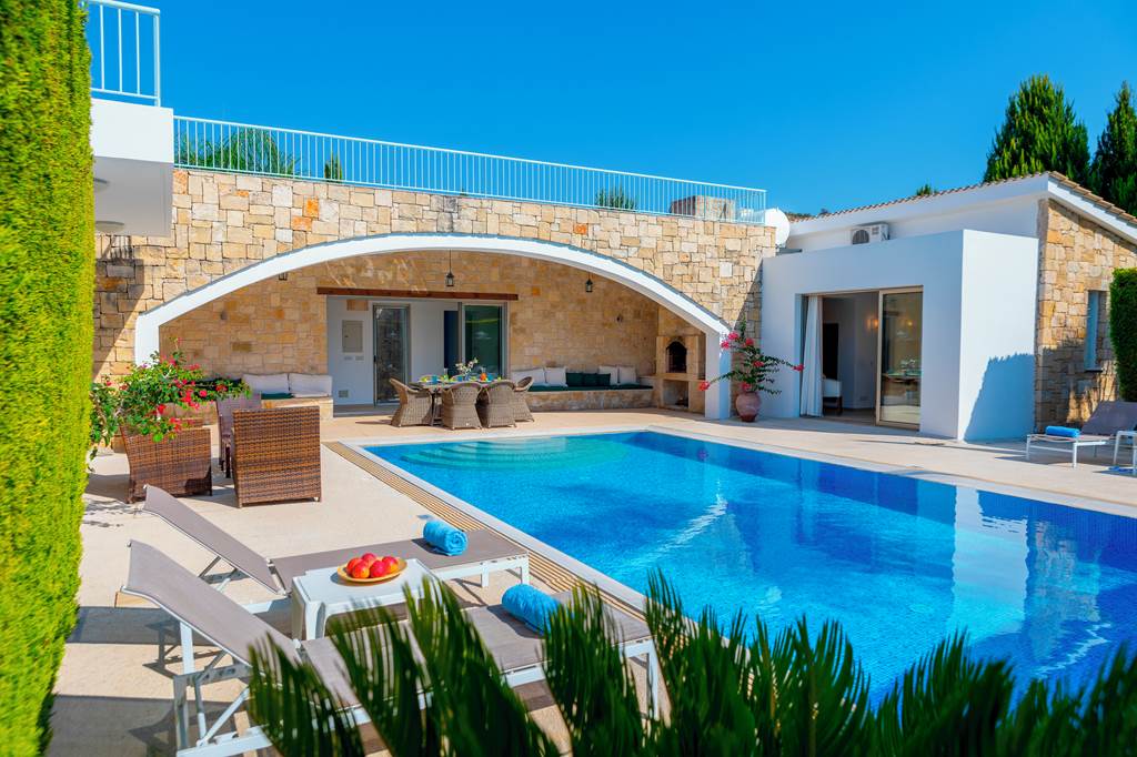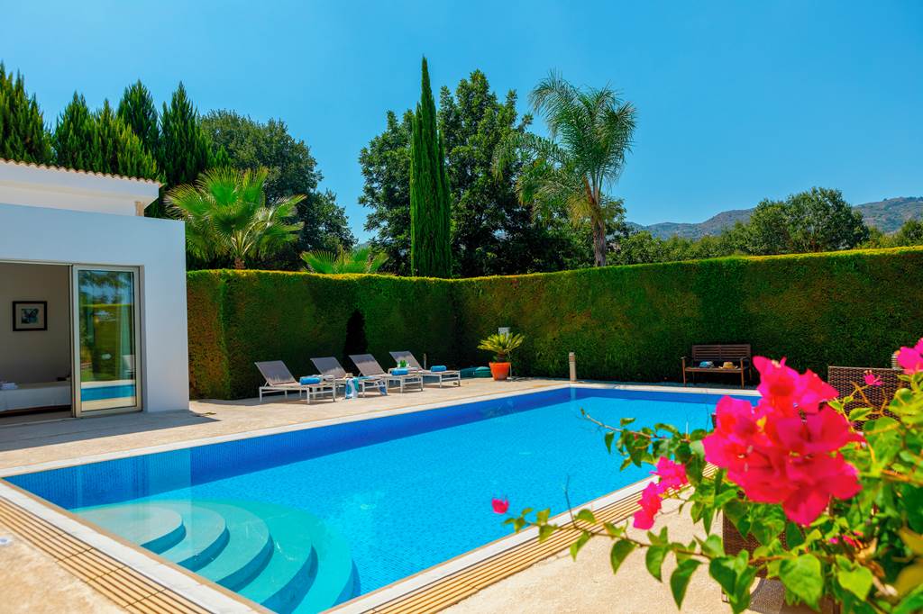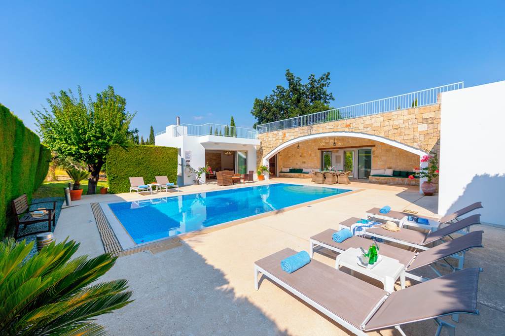Reached via a private drive just off from the Paphos/Polis road set amongst a large plot is Villa Zoe. Designed across one level the property has been completed to an extremely high standard, offering stylish furnishings and light airy rooms. A traditional Greek entrance resembles the original features of an old Greek manor house. The large open plan and stylish living/dining room has a feature fireplace, satellite television (limited channels), DVD player and CD/Radio which is piped throughout the villa. Large sliding doors open from the living area out to the poolside terrace. The well equipped kitchen with integral utility has all mod cons and comes complete with everything you need for a self catering villa holiday. There are three bedrooms at Villa Zoe, two double bedrooms and a twin bedroom each with en-suite bathrooms. ... More