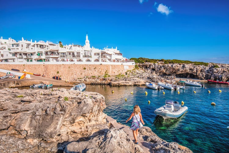 You can really see the fishing village appeal of Binibeca, with its horizon of whitewashed architectural gems and scattering of kayaks by the shore. Gentle waves rolling against a picturesque cove, loungers for sun-lazing, and ice cream vans dotted around make for a real tribute to Menorca’s marvellous beaches.