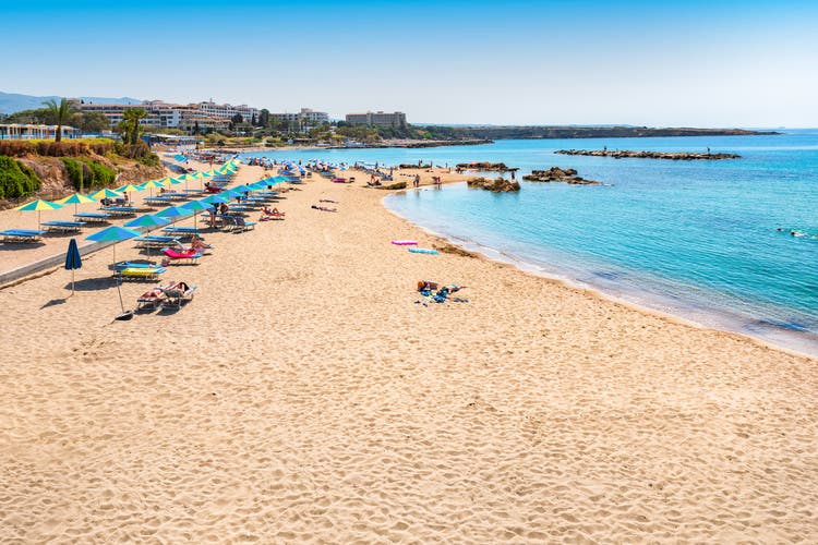 The Blue Flag beach is the jewel in Coral Bay’s crown – it’s wide, flat and covered in powdery golden sand. You can snorkel in the clear water, set off on a catamaran trip or just enjoy a doze on a sunbed. Behind the sand, rustic tavernas and cafés line the sun-soaked waterfront.