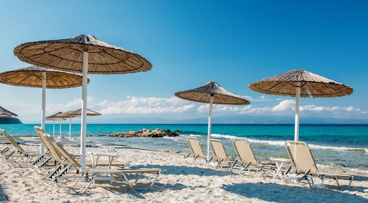 The main beach of Afitos is located below the cliff on which the village sits. It's a long, sandy beach with incredibly clear, turquoise waters. There are organised sections with sunbeds and umbrellas offered by beach bars, as well as free, unorganised sections.