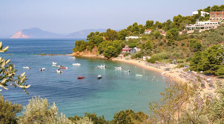 Your first port of call here for sun, sea and sand is Troulos Beach. Right on your doorstep, this sandy haven is a quiet place to bask in the rays. A short drive to the west takes you to Koukounaries Beach, one of the most famous and picturesque in Skiathos, or go east for Vromolimnos Beach.