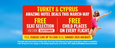 Make it Turkey or Cyprus this spring with amazing hotel deals! And for a limited time only, you can get free seat selection with code SEATSONUS, as well as snapping up your Free Child Place^ – available on every flight. And don’t forget the £75pp sale savings...