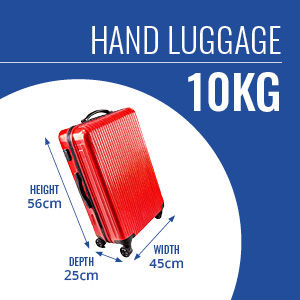 You can bring one piece of hand luggage onboard free of charge, as long as it weighs no more than 10kg and is no larger than 56cm x 45cm x 25cm, including any wheels and handles. If your hand luggage weighs more or is larger than this, it will need to be checked into the aircraft hold, and you may have to pay an additional charge.