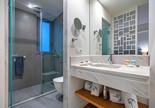 • Bathroom containing a shower.