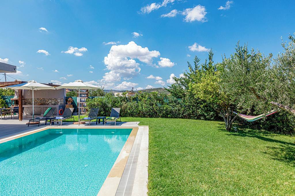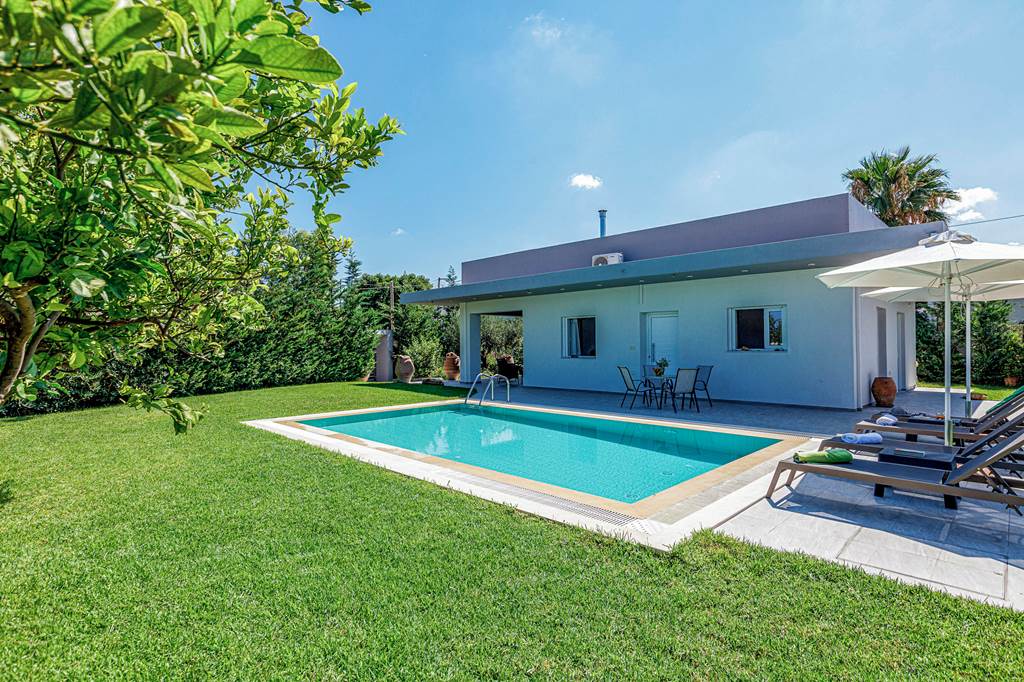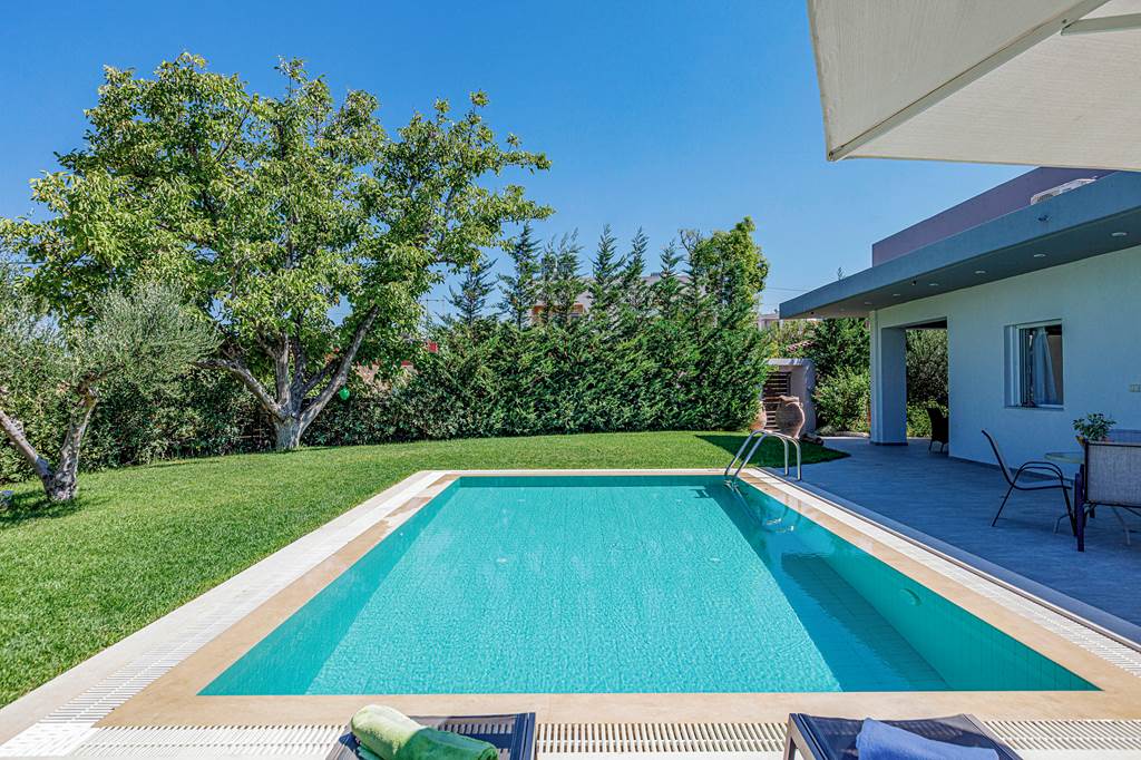 Villa Arhontia, set on one level and within a large enclosed garden. In the village of Ageliana – just 3km from the small town of Perama in the district of Rethymnon. Equally ideal for couples or families with children, the villa interior is bright and inviting, simply furnished in modern style, offering a wrap- around terrace, super shaded outdoor dining and barbecue. The pool sits in a large, lawned garden with trees and shrubs which would be great for families. ... More