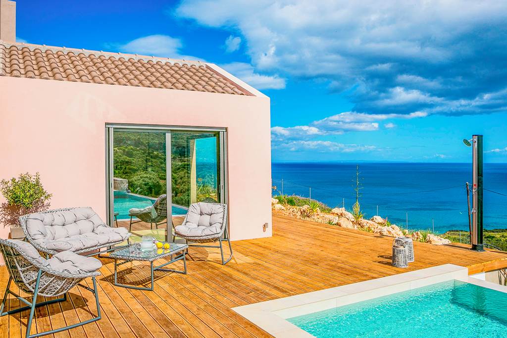 This gorgeous modern villa stands high above Skala beach with incredible panoramic views that take in the entire length of the beach, the town of Skala and extend away across the south coast of Kefalonia to Zakynthos, encompassing the rugged hillsides and traditional hamlet of Old Skala. Just under one kilometre from the coastal road, where you will find supermarkets, restaurants and cafes, lies a glorious stretch of sandy beach just opposite and the centre of Skala is just a short drive along the sea front. With gorgeous views from all rooms, stylish yet simple interiors in earth tones are superbly comfortable, with colour accents highlighted by large canvasses, collected by the owner during her time running an art gallery. The large decked area offers privacy and plenty of space to enjoy the pool and the never ending views. Although ideal for a couple, a galleried seating area upstairs offers the possibility for a third person to sleep in comfort with an adjoining shower room. ... More