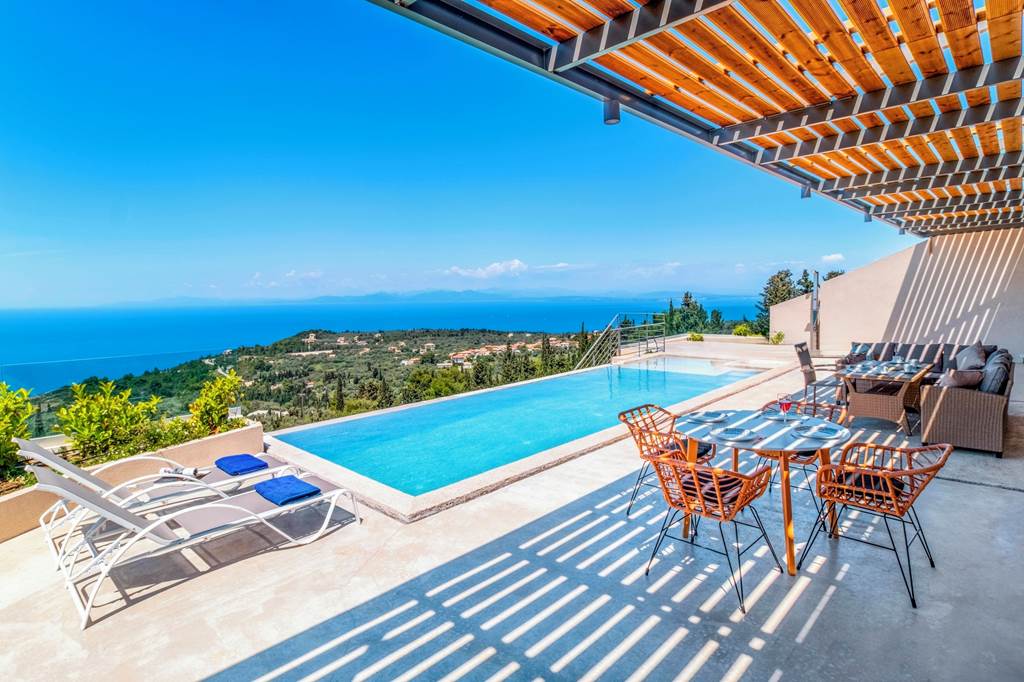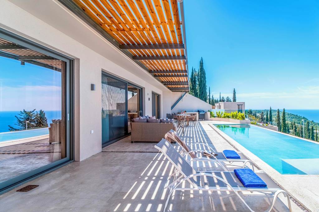 Clinging to the hillside overlooking the endless blue Ionian sea towards the Ionian coastline of Epirus is the charming "cave" house, Villa Andromeda Sunset. Reached by a steep driveway leading down from the entrance gates, conveniently there is parking for one car right outside the house. All the rooms face the pool terrace and the breath-taking view beyond. The living room with dining area is open plan to the kitchen and this entire area is bordered by large glass doors offering endless views at every turn. The exterior area offers a generous terrace with al fresco dining and barbecue area as well as supremely comfortable sunbeds for lounging by the pool. The oversized rectangular infinity pool offers glorious views down the steep wooded hillside to the sea and many hours will surely be spent just gazing out to the sea from the sunbeds and outdoor seating provided. ... More