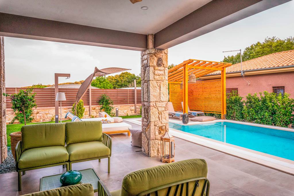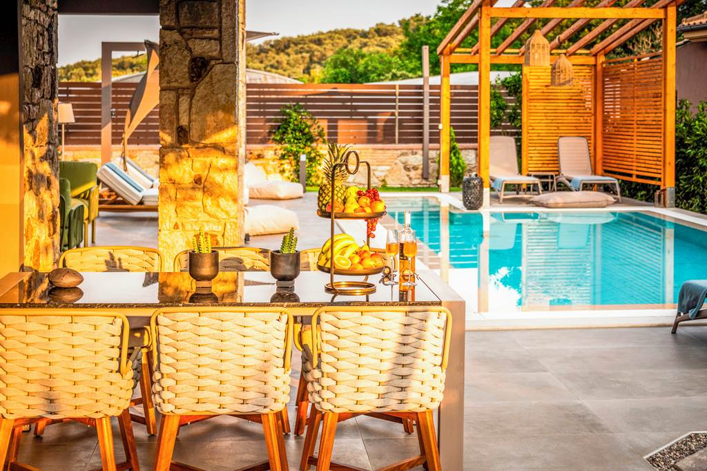 Sleek, sophisticated, and stylish are what come to mind when we think of River Villa Elite. Designed to impress, its straight-cut architecture and rustic stone walls perfectly blend traditional Ionian architecture with modern exterior design. As you walk through the front door, there’s an easy simplicity to the layout, with striking art pieces, contemporary furnishings, and minimalist décor. The main living area has doors that slide away, creating a seamless barrier between the indoor and outdoor spaces. With plush sofas in one corner and a fully-equipped sleek kitchen in the other, the interiors are a cosy retreat after a day at the beach. The bedrooms are sleek and stylish, with three bedrooms spread across the villa. ... More