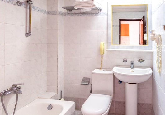 • Bathroom containing a bath with shower attachment.