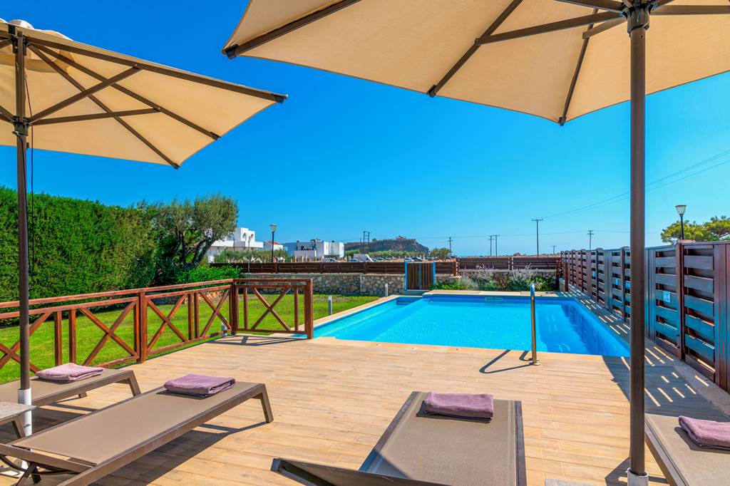 This lovely two bedroom villa is positioned just a short walk from Lindos village and offers everything a couple, family or small group could ask for. With a beautiful lawn and terraces to the front and rear, a barbecue and a private pool with loungers, the fun doesn’t stop. Guests can enjoy a game of table tennis, lounge by the pool or cook up a barbeque. The open plan living space allows for an indoor break from the sun in front of the TV, or a chance to whip up a meal in the well-equipped kitchen. There is also direct access to both front and rear terraces. Upstairs, both bedrooms have their own balcony and the double room even has views of the Acropolis. ... More