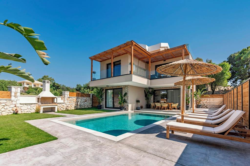 Situated in the charming village of Agios Sostis, Cameo Villa 2 is a four bedroom, four bathroom haven designed for relaxation and convenience. As part of an exclusive complex of three villas, this stylish property is ideal for families or groups of friends looking to experience the beauty of Zakynthos in comfort and elegance. Cameo Villa 2 boasts four beautifully appointed bedrooms, each with its own open plan en-suite bathroom, providing the utmost space and comfort for every guest. The villa’s interiors are tastefully decorated, blending modern design with subtle island-inspired touches. The spacious living and dining areas are perfect for unwinding together, while the fully equipped kitchen caters to all your culinary needs. The villa’s private terrace offers the perfect setting to relax and enjoy the sunshine. Whether you are dining al fresco, sipping your morning coffee, or planning a day of adventure, the outdoor space is designed to make the most of Zakynthos’s stunning natural environment. ... More