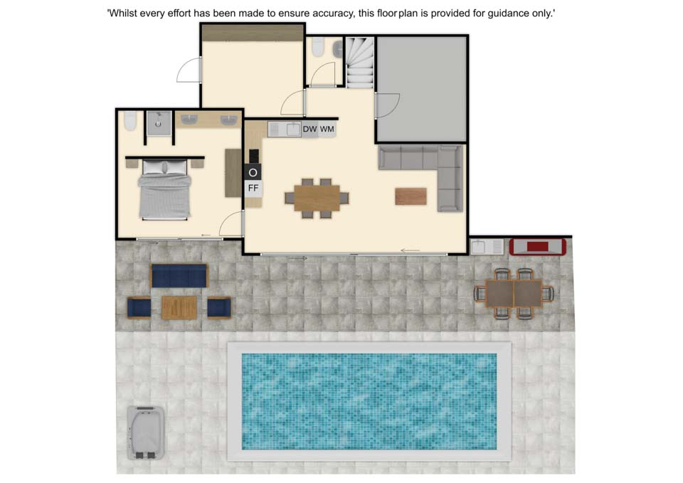 Please note: The pool has an infinity edge. For your safety please do not use inflatables in the pool, walk, sit or stand on the infinity edge. Ensure children remain supervised at all times.