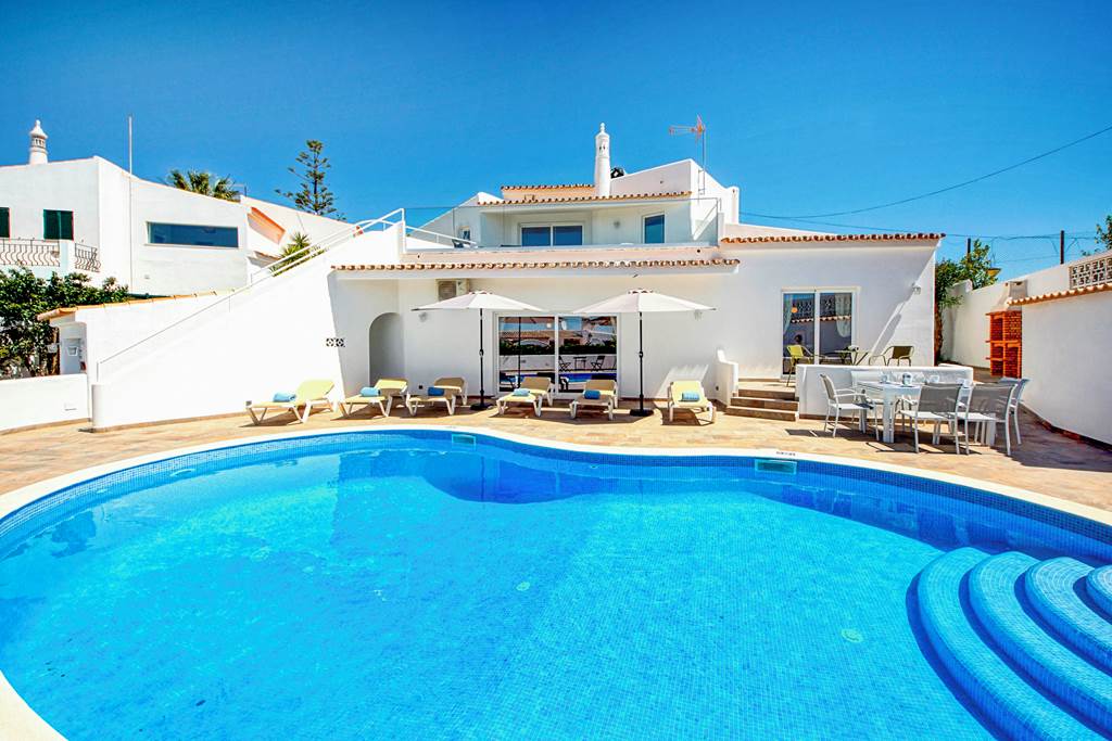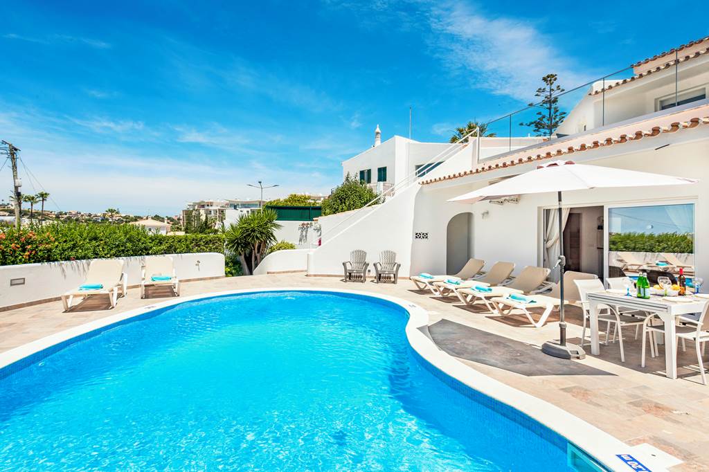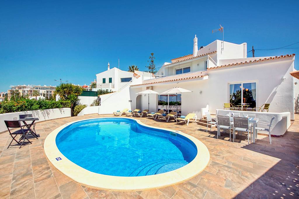 This charming villa in Albufeira offers the blend of comfort, style, and convenience for a relaxing getaway. The property features a private pool surrounded by a patio terrace, ideal for sunbathing and outdoor relaxation as well as a brick barbeque for alfresco dining on warm evenings. The villa boasts three inviting bedrooms, including a spacious master suite on the first floor that offers stunning sea views and a private balcony that leads down to the pool area, creating a cosy and private retreat. The location is highly convenient, with nearby amenities and a beautiful beach just a short distance away. A car is optional, making it easy to enjoy everything Albufeira has to offer, from local restaurants to charming shops and coastal attractions. Whether you’re lounging by the pool, exploring the town, or taking in the breathtaking views, this villa provides the ideal base for your Portuguese vacation. ... More
