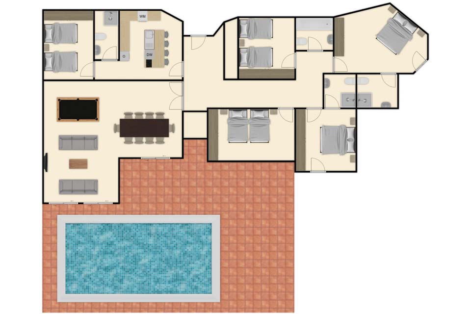 Please note: This villa is on a split level. Bedrooms 2, 3 (and their ensuites) bedrooms 4, 5 and one shower room are accessed via 5 internal steps.