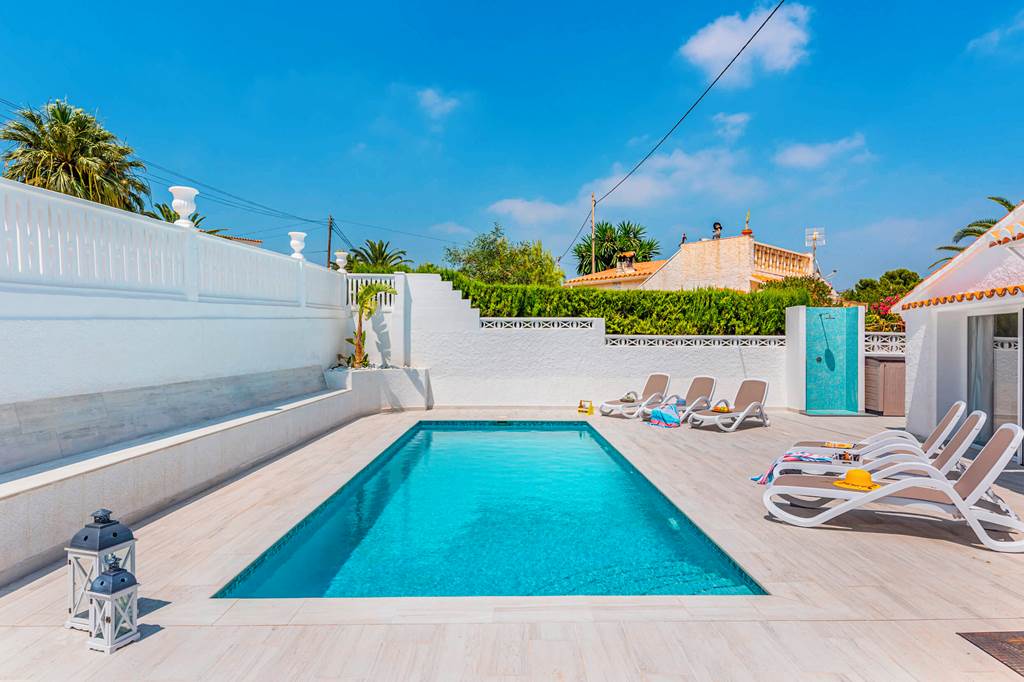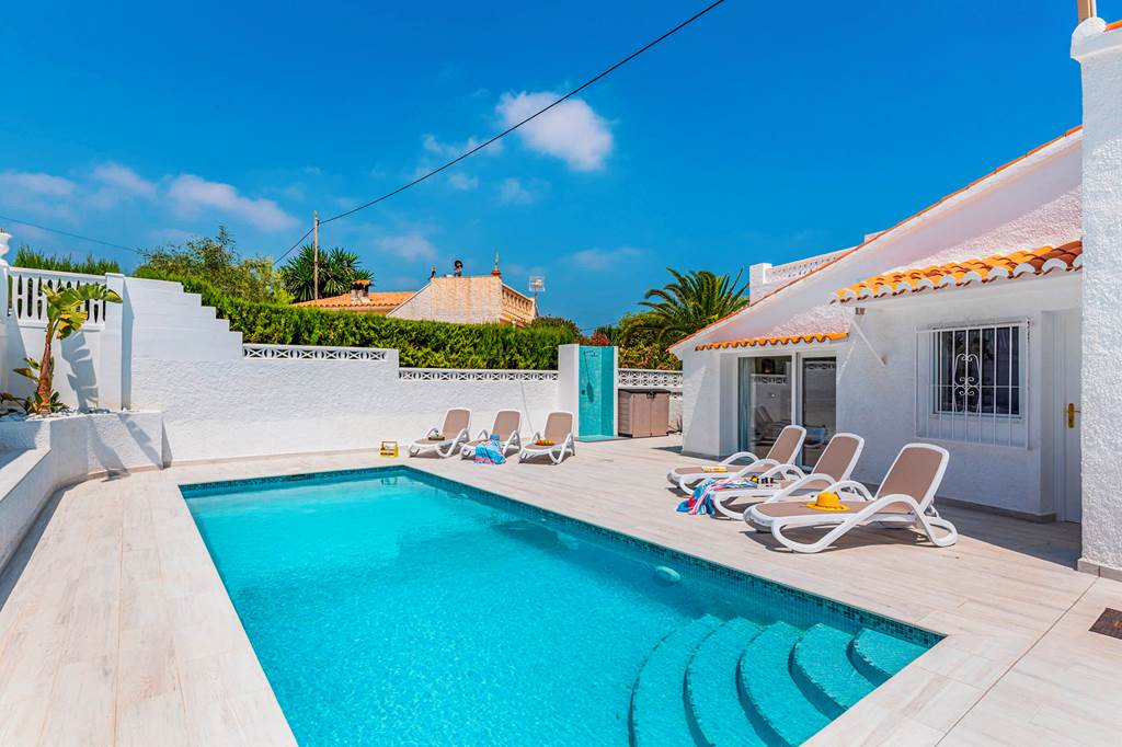 Villa Amanecer is a traditional and well appointed three bedroom detached property in an elevated position in an urbanisation on the outskirts of Calpe. Designed over one level, the villa offers a comfortable living area open planned with dining option to modern kitchen with access to the pool area. There are three double bedrooms each offering a shower room ensuite. The living area and all bedrooms offer air conditioning for your comfort and Wi-Fi is readily available throughout the villa. Outside the pool is generously proportioned and private, with a convenient poolside shower, perfect for long, lazy days of swimming and soaking up the sun. For those wanting to explore further, the busy resort of Calpe with its sandy beaches is just a short drive away. ... More