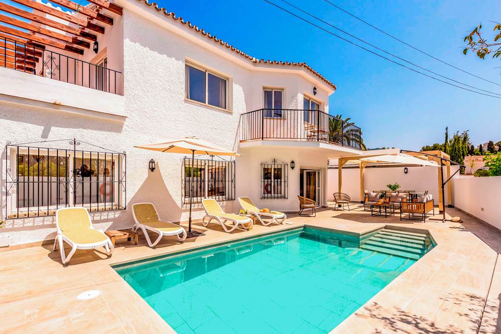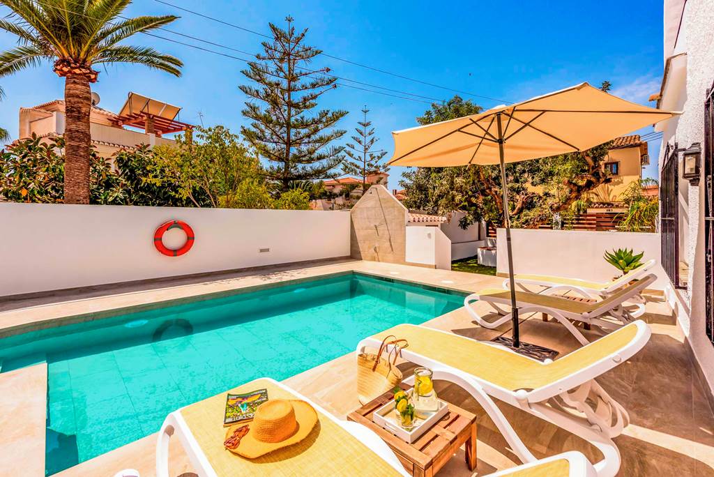 This five-bedroom villa offers both a spacious interior and exterior decorated with stunning earth tones. Step inside and be met by a bright living space with crisp white walls reflecting the glorious sunshine. Lounge on the cloud-like sofas whilst watching the flat-screen TV and adjust the temperature to your liking thanks to the air conditioning with both heat and cooling functions. Enjoy a home-cooked meal at the stylish dining table after cooking up a storm in the fully equipped kitchen. Also on the ground floor is one of the five bedrooms, the spacious double room has fitted storage and air-conditioning. Heading upstairs, you'll find the four other bedrooms, two twins, and two doubles all with air-conditioning. The largest double has access to the large shared balcony with extra sun loungers and a dining table and a private en-suite. Outside is where the magic happens, the modern tiled pool terrace has sun loungers and parasols surrounding it for those who enjoy sunbathing but for those who prefer to enjoy the shade, there are many covered areas including the table tennis area. Ideally located, El Algarrobo is just a few hundred metres from all amenities you need for a fantastic holiday. Within short walking distance, you will find an array of shops, bars, restaurants, and well-loved sandy beaches. ... More