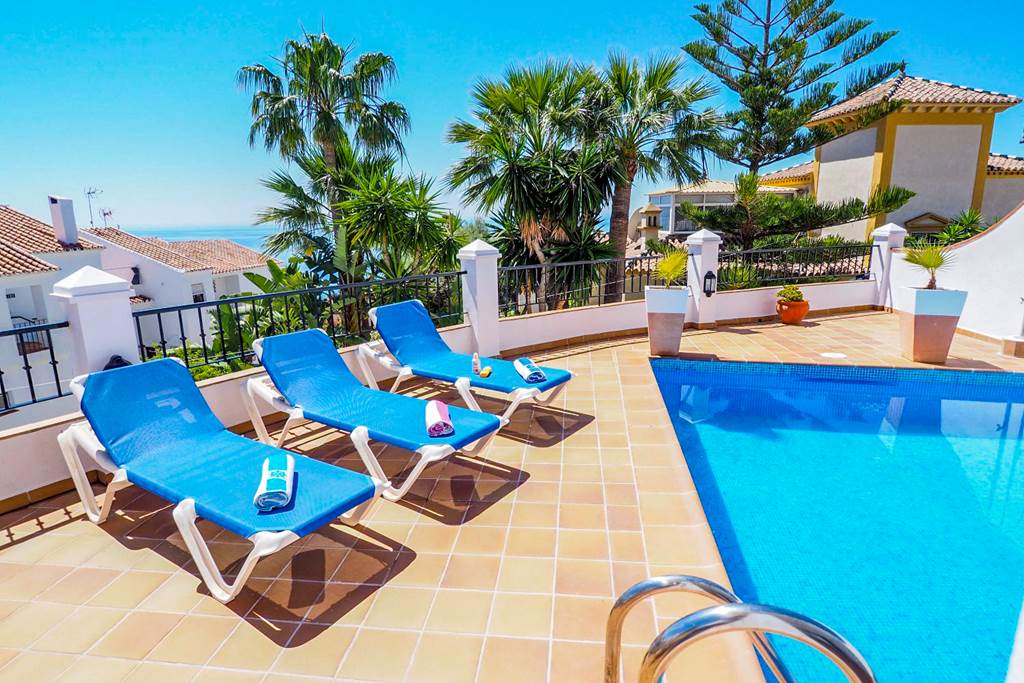 Situated in the Capistrano Playa area of Nerja, above the famous Burriana Beach, this beautiful property commands the same spectacular sea views as its sister houses, Dos Ardillas, Azalea and Las Brisas. Burriana beach with its array of bars and restaurants is only a 9 minute walk away. The property is entered via a few steps to an entrance hall. From here a short flight of stairs lead up to the top floor where there is a cloakroom/toilet, large lounge/diner and fully fitted kitchen. The lounge is equipped with Sat TV, DVD Player, CD player and free WIFI. Patio doors lead on to a large terrace with wonderful sea and coastline views. Furnishings throughout are of a very good standard in a contemporary style. From the lounge/dining area a staircase leads up to a roof terrace from which there are stunning panoramic views. Downstairs from the entrance hall there are 3 bedrooms, 2 twins which share a full bathroom and a large double bedroom with en-suite facilities. From the double bedroom patio doors open on to the pool and its terrace area. All bedrooms have reversible air-conditioning units providing heat/cooling as required.The property benefits from a private parking space. ... More