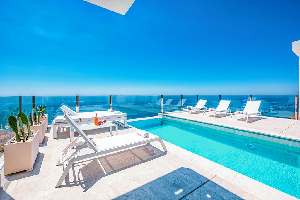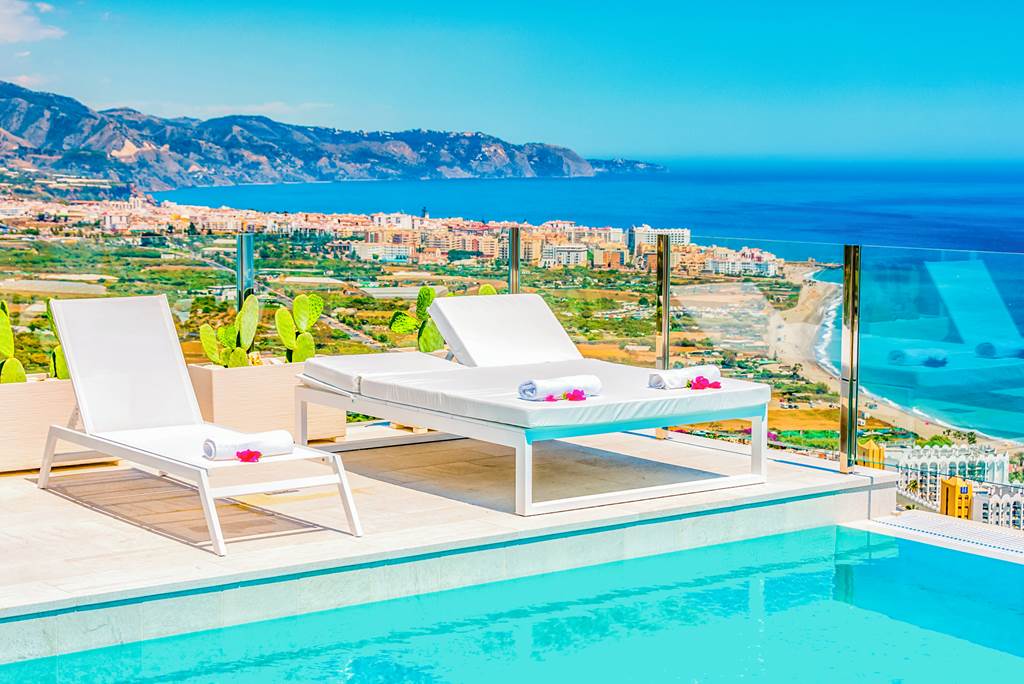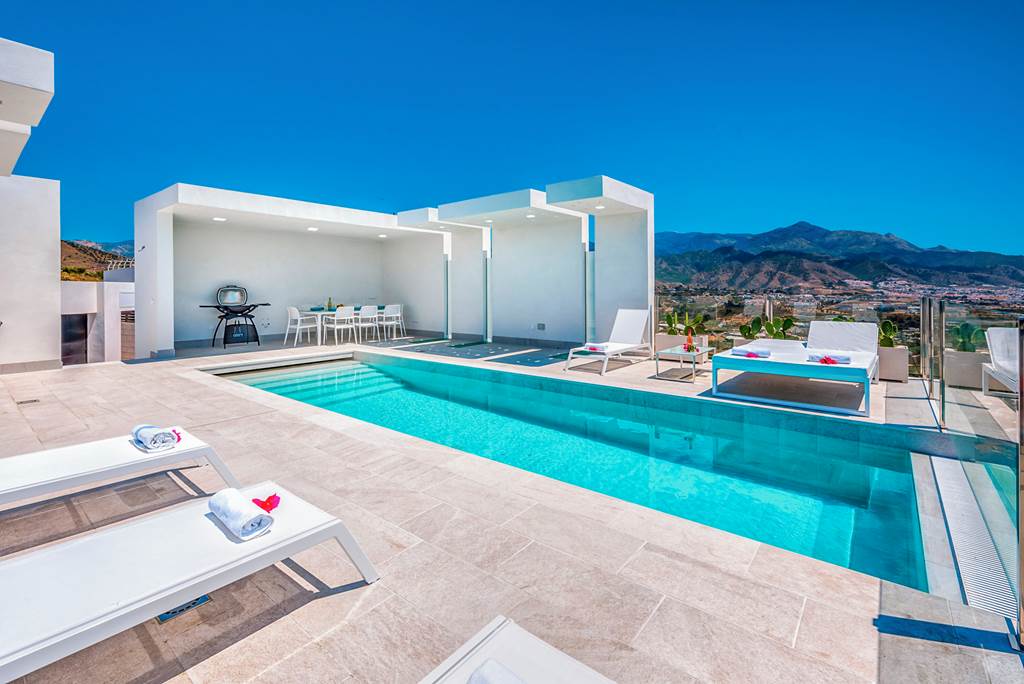 Searching for style, spectacular sea views and a sought-after location? Have we got the Spanish showstopper for you! Designed over three floors, the four-bedroom Villa Tierra Agua takes elegance to the next level with whitewashed walls, chic décor and a dreamy rooftop pool. Expect an unbeatable panoramic vista of dazzling shores and turquoise waters as far as the eye can see. When the sun goes down, gaze over Nerja’s twinkling lights – the magic never stops! Head downstairs and you’ll find a contemporary kitchen, lounge and dining area with sliding doors out to the terrace – this open-plan pad is just perfect for socialising. ... More