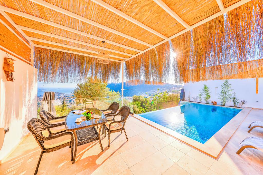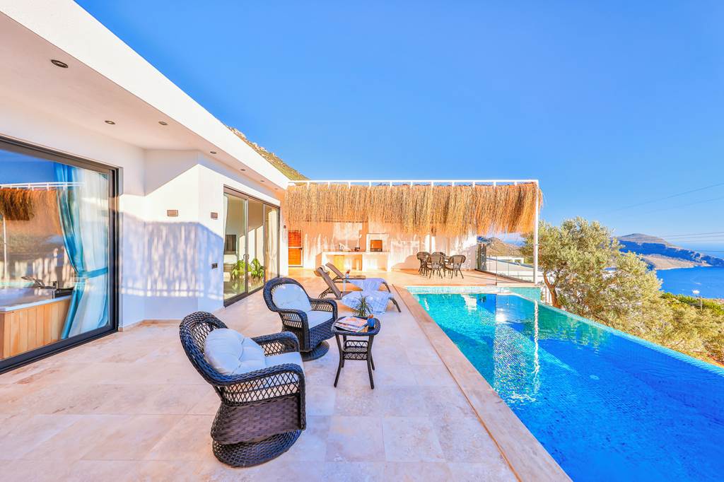 Nestled amidst the picturesque landscape of Kalkan, Villa Puhu awaits, promising an idyllic retreat for discerning travelers. Offering a seamless blend of comfort and opulence, this villa presents a haven for relaxation and romance. Stepping inside, you'll find yourself welcomed by a charming open-plan layout, seamlessly connecting the modern kitchen and inviting lounge area. Air conditioning ensures a comfortable atmosphere throughout, inviting guests to unwind and savor the tranquility of their surroundings. The bedroom, adorned with understated elegance, beckons with promises of restful nights. Here, guests will discover not only a plush double bed but also a sanctuary of indulgence featuring an opulent whirlpool bath, ideal for unwinding after a day of exploration. Additionally, an ensuite shower room awaits, boasting a walk-in shower for added convenience. Venturing outdoors, the allure of Villa Puhu continues with its private infinity pool, offering refreshing dips under the warm Mediterranean sun. Embrace alfresco dining experiences with the brick-built barbecue, perfect for grilling up savory delights while relishing in the stunning views that surround. Designed with couples in mind, Villa Puhu sets the stage for intimate moments and cherished memories, making it the perfect choice for those seeking a romantic escape in the heart of Kalkan. ... More