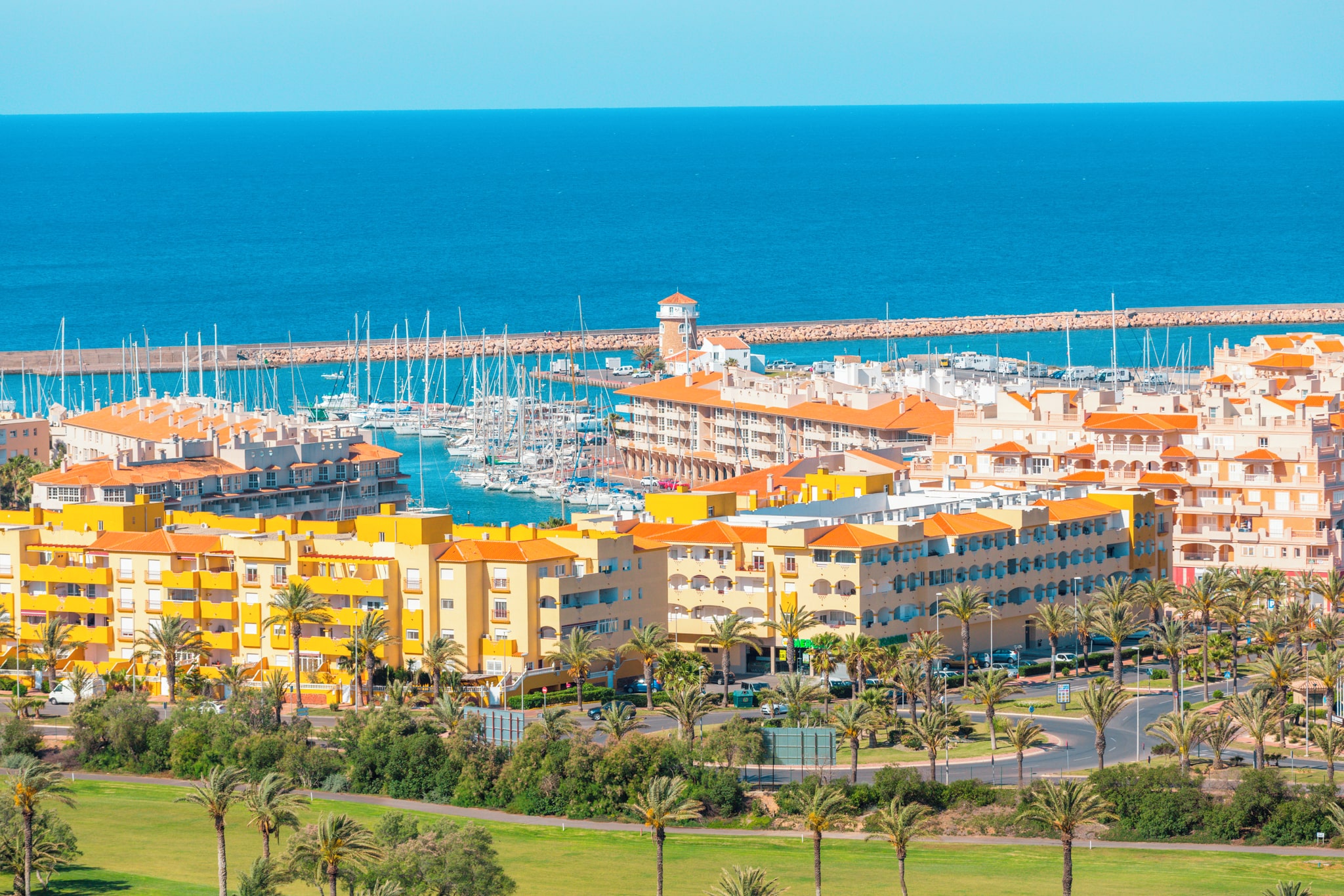 Sun-lit leisure times are on the cards in this modern coastal town. A bright green golf course and a yacht-filled marina set the scene for good times.